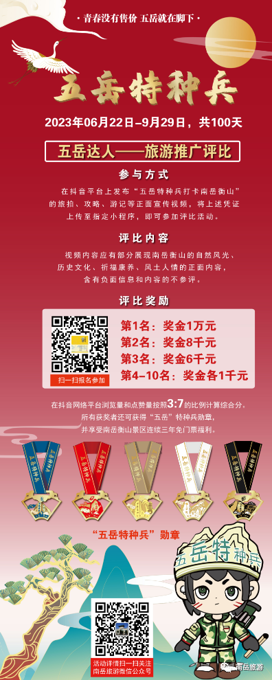 活動期間(jiān)內(nèi),參與者憑東嶽泰山(shān)、西嶽華山(shān)、中嶽嵩山(shān)、北嶽恒山(shān)景區(qū)中任何一嶽的通(tōng)關文牒、打卡照片、門(mén)票(piào)等行(xíng)程證明(míng)資料,可(kě)以免費遊覽南嶽衡山(shān)景區(qū)(含中心景區(qū)、南嶽大(dà)廟、水(shuǐ)簾洞)。